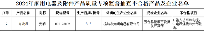 其中,2025年1月,山西省市场监督管理局发布《山西省市场监督管理局关于电子及信息技术产品、家用电器及附件产品质量专项监督抽查结果的通报》。该通报显示,1批次标称由“温岭市光明电器有限公司”生产的商标为“光明”的电吹风被检出不合格,规格型号为RCT-2300W,受检企业名称为五台县鹏展百货批发经营部,不合格项目为输入功率和电流、电源连接和外部软线。