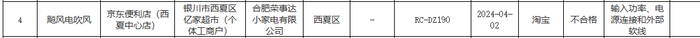 2024年11月,宁夏回族自治区市场监督管理厅发布《自治区市场监管厅关于2024年度电商领域销售产品质量专项监督抽查结果的通告》。该通告显示,1批次标称由“合肥荣事达小家电有限公司”生产的飚风电吹风(RC-DZ190)被检出不合格,不合格项目为输入功率、电源连接和外部软线。