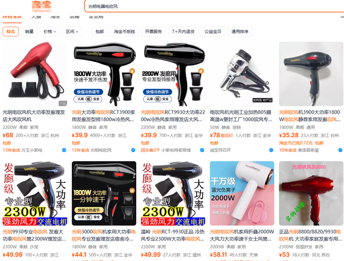 《消费者报道》记者发现,在电商平台上,光明电器的吹风机销量不低,价格较为亲民,如39.9元、68.0元、49.9元,商家宣称的关键词涉及“大功率”“大风力”“发廊级”“专业型”“千万级”“专业吹风机”等。