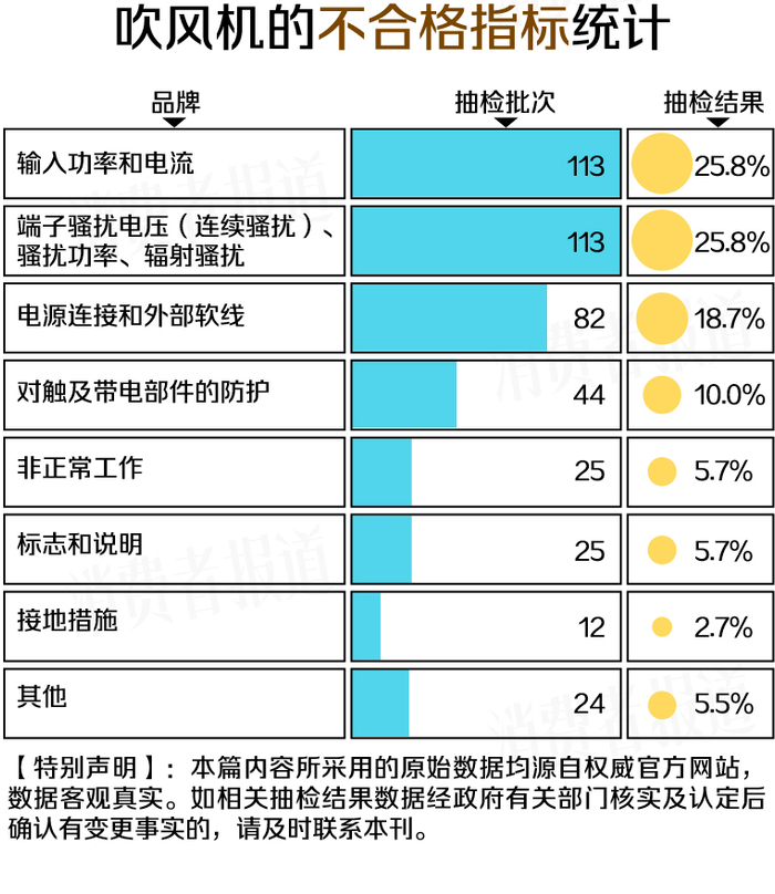 输入功率和电流,113批次不合格,占比25.8%。输入功率是反映家用电器产品实际输入功率和额定输入功率的偏差是否在标准规定范围内的指标。偏差过大可能会导致消费者选取到不配套的电源、插座,使用会造成过载现象,从而引发触电、火灾等危险。