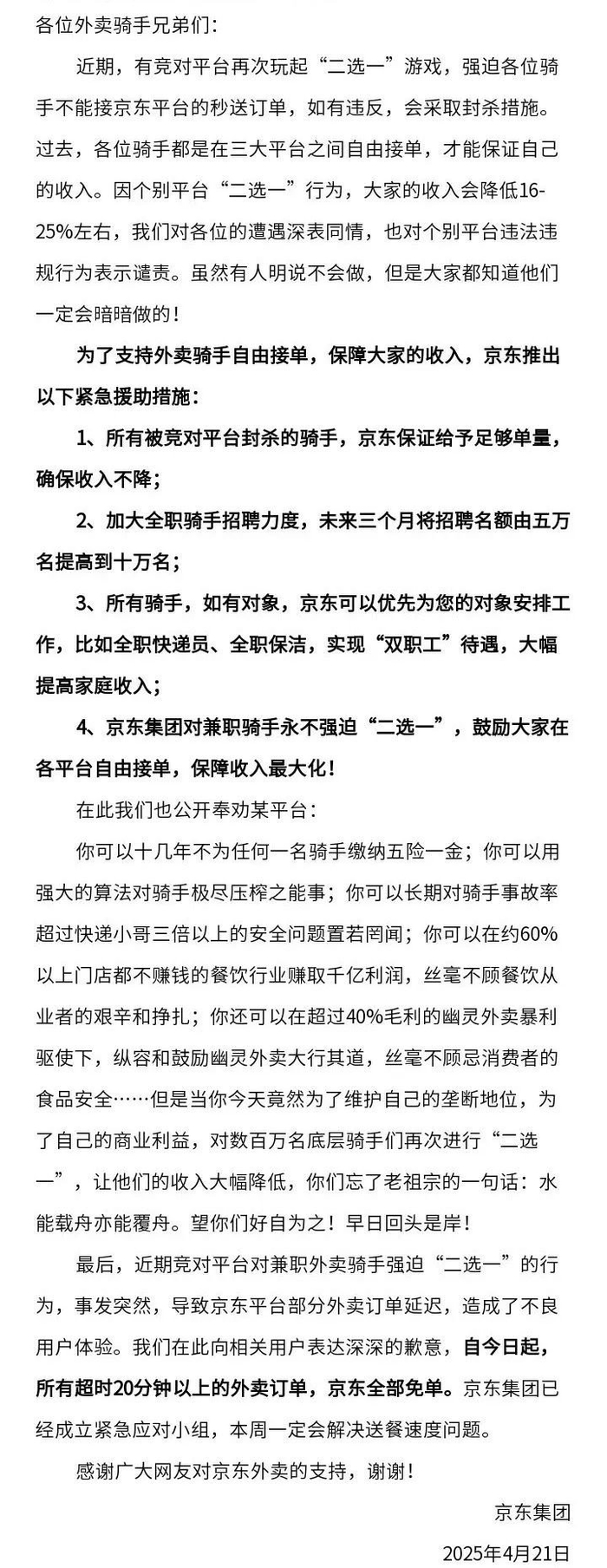 4月21日,京东发布《致全体外卖骑手兄弟们的公开信》,信中提到,近期有竞对平台再次玩起“二选一”游戏,强迫骑手不能接京东平台的秒送订单,若有违反便会采取封杀措施。