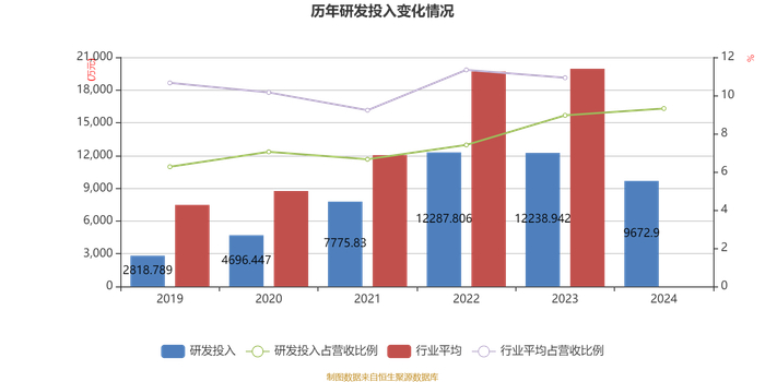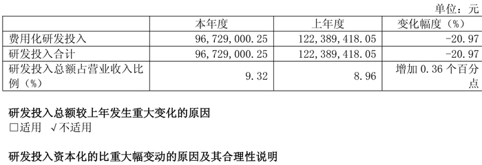 2024年全年,公司研发投入金额为9672.9万元,同比下降20.97%;研发投入占营业收入比例为9.32%,相比上年同期上升0.36个百分点。
