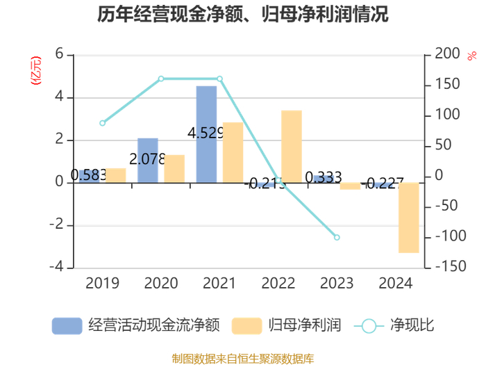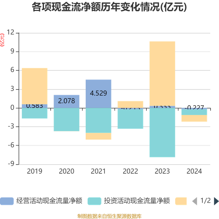 截至2024年,公司经营活动现金流净额为-2274.76万元,同比减少5606.62万元;筹资活动现金流净额-1.07亿元,同比减少11.36亿元;投资活动现金流净额-8997.18万元,上年同期为-7.88亿元。