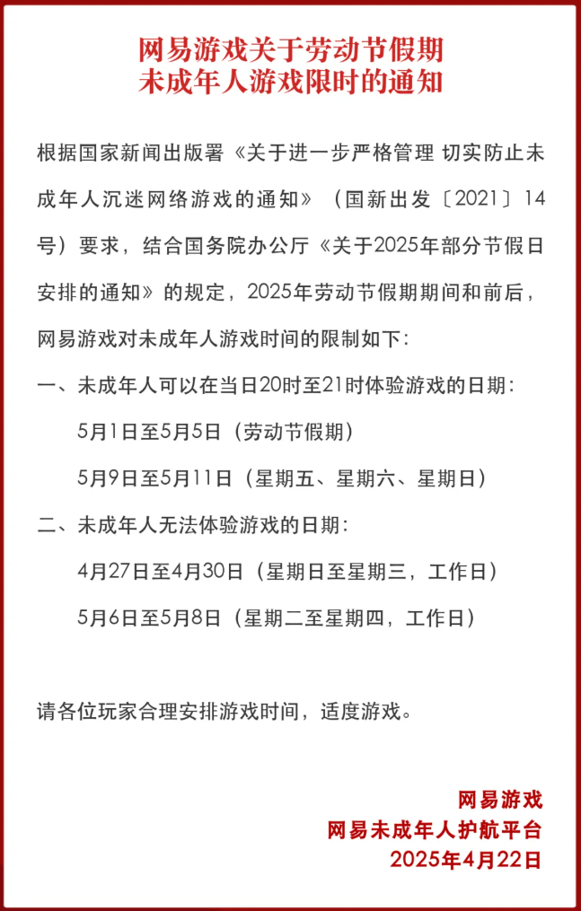 4月22日,网易游戏发布关于劳动节假期未成年人游戏限时的通知:未成年人可以在当日20时至21时体验游戏的日期为5月1日至5月5日(劳动节假期)、5月9日至5月11日(星期五、星期六、星期日)。未成年人无法体验游戏的日期为4月27日至4月30日(星期日至星期三,工作日)、 5月6日至5月8日(星期二至星期四,工作日)。