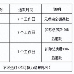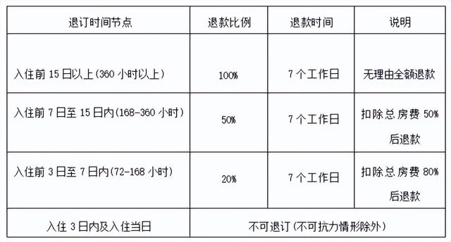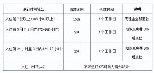 在退订规则方面,非法定节假日期间,消费者入住前7日以上可无理由全额退款;法定节假日(元旦、春节、清明节、劳动节、端午节、中秋节与国庆节)期间,入住前15日以上可无理由全额退款。