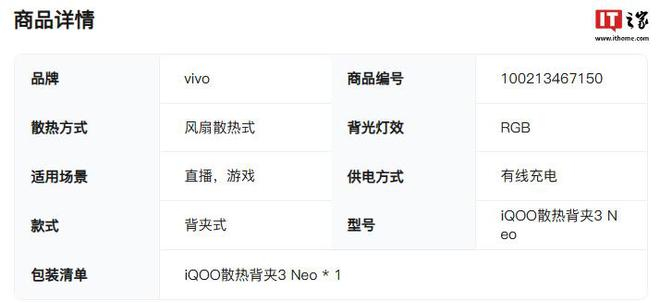 IT之家从京东商品详情页获悉,iQOO 散热背夹 3 Neo 采用有线充电的方式进行供电、拥有 RGB 背光灯效。