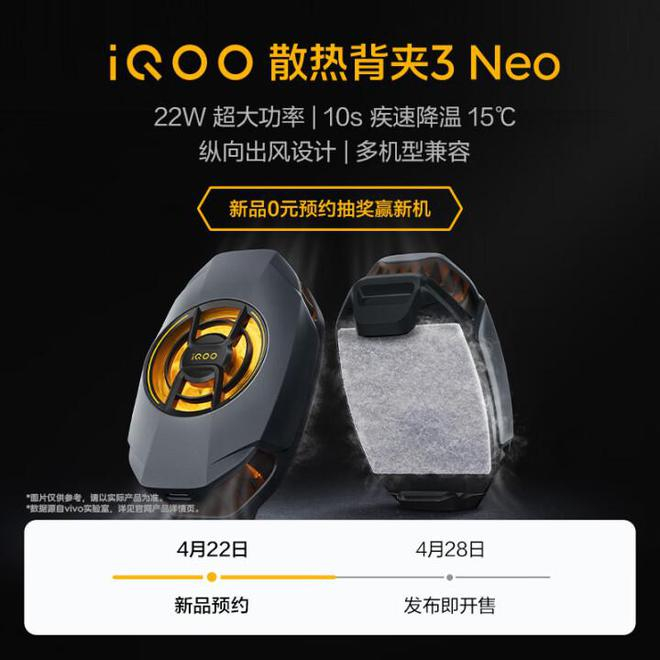 IT之家 4 月 22 日消息,iQOO 手机官方今日发文宣布,iQOO 散热背夹 3 Neo 开启预约,新品将于 4 月 28 日 19:00 发布。