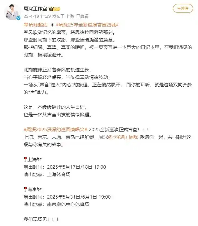 4月19日,华语乐坛实力唱将周深在个人社交平台官宣:“2025我们的新巡演来了”,正式官宣2025年全新巡回演唱会“深深的”,首批公布的巡演城市包括上海、南京、太原、青岛四站。其中,青岛站作为重要一站,引发广泛关注,大麦App显示该场次已进入“筹备中”状态,当前“想看”人数突破34万。