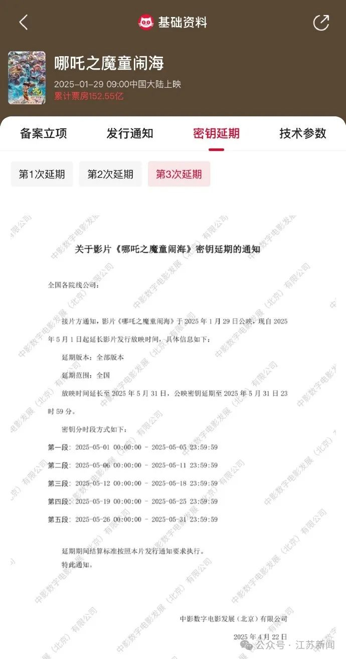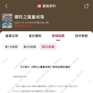 据猫眼专业版显示,《哪吒之魔童闹海》密钥第三次延期,延长上映至5月31日,截至当前全球票房已超157.03亿。