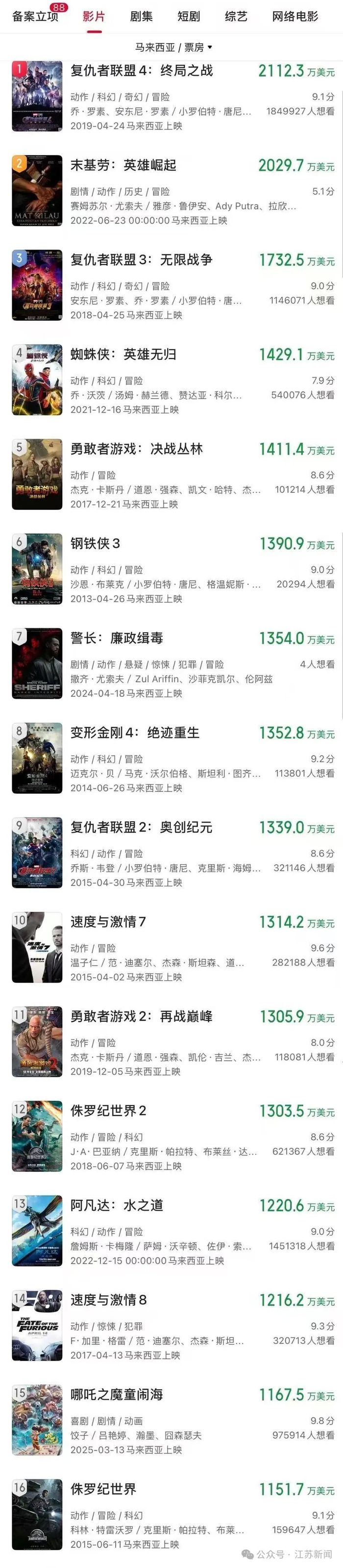 另据网络数据显示,电影《哪吒之魔童闹海》马来西亚票房突破1167.5万美元,进入马来西亚影史票房榜前十五。