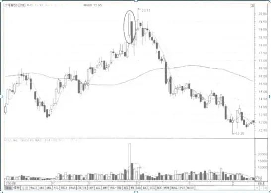 如图2-47所示的万东医疗股价在快速拉升并连续创下历史新高后,在顶部形成了乌云压顶的组合,说明多方和空方力量开始逆转,空方力量增强,随后进入了回调下降通道。