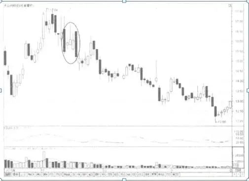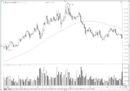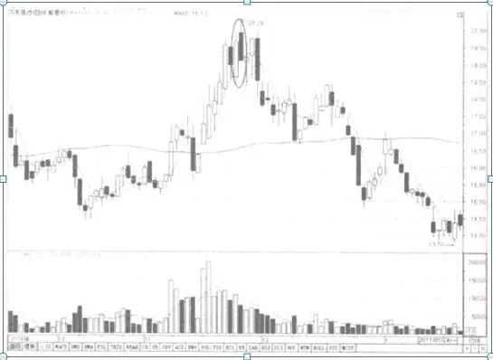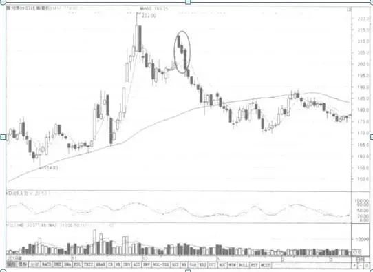 如图2-45所示的五粮液,就是在股价上涨的末期出现了黄昏之星的组合。股价随后开始转为下跌行情。