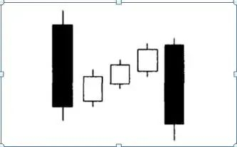与上升三部曲相反,该组合先出现一根大阴线或中阴线,接着出现3根向上升的小阳线,但这3根小阳线的收盘价都低于阴线的开盘价,最后一根大阴线或中阴线又吞吃了前面3根小阳线。是一种强烈的卖出信号,后市看跌。投资者遇到这类走势,应该逢高卖出。