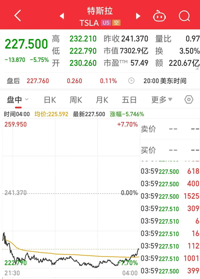 北京时间4月22日,特斯拉美股收盘报227.5美元,股价下跌5.75%,市值跌至7318亿美元。