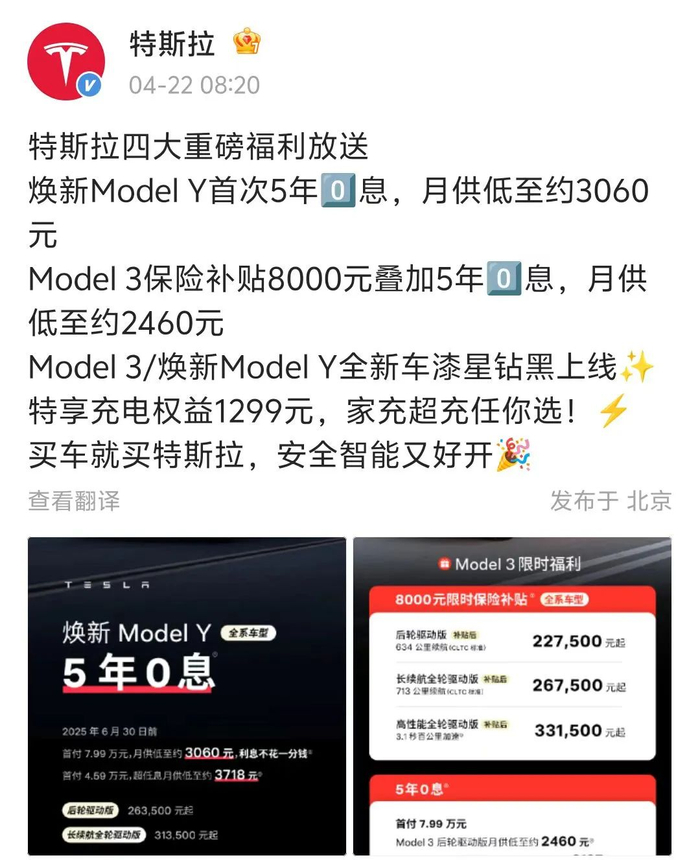 4月22日,特斯拉中国宣布,6月30日前,焕新Model Y首次全系推出5年0息,首付7.99万元,月供低至约3060元。