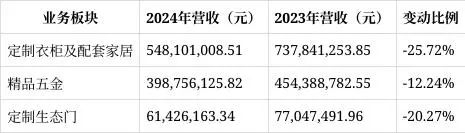 从业务板块来看,定制衣柜及配套家居收入548,101,008.51元,同比下降25.72%;精品五金收入398,756,125.82元,同比下降12.24%;定制生态门收入61,426,163.34元,同比下降20.27%。公司表示,近年来受宏观环境影响,行业增速放缓,市场竞争加剧,导致市场开拓、销售订单不及预期,是营业收入下降的主要原因。