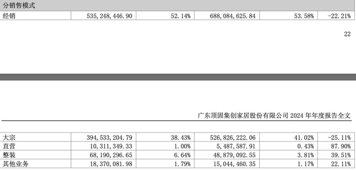 从销售模式(渠道)来看,经销商渠道仍是公司主要经营渠道,营收5.35亿元,占比52.1%,大宗业务营收3.95亿元,占比38.43%,但直营、整装业务增长较快。