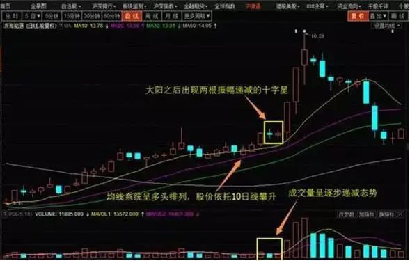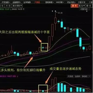 “双飞燕”是一种K线技术形状,走势上出现大阳之后两根并排上扬成交量和振幅逐步递减的十字星,且均线系统通常以完美的多头排列列示,股价沿着10日均线强劲攀升。当“双飞燕”形状出现后,股价一般都有15%以上的涨幅,从这个意义上说,双飞燕还有着推测顶部之功能。要注意“双飞燕”出现的位置,位置低,期望值可大些,位置高,期望值就要小些,而且随时准备清仓离场。如下图