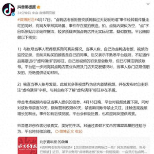 4月22日,@抖音黑板报 通报:4月17日,“卤鸭店老板拒售变质鸭躲过天花板坍塌”事件经转载传播走红的同时,有网友举报其场景、事件存在摆拍痕迹。如,卤锅内疑似为空,“卤”字白纸张贴月余始终整洁,较多质疑声指卤鸭店并无实际经营,疑似摆拍。平台随即做以下核实: