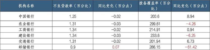 但另一方面,六大国有行中,除邮储银行总体不良率升了7个基点至0.90%,其余五个总体不良率均出现整体不良率的同比下降趋势。