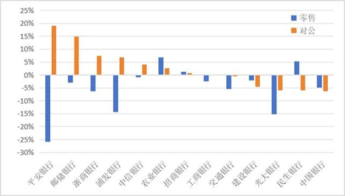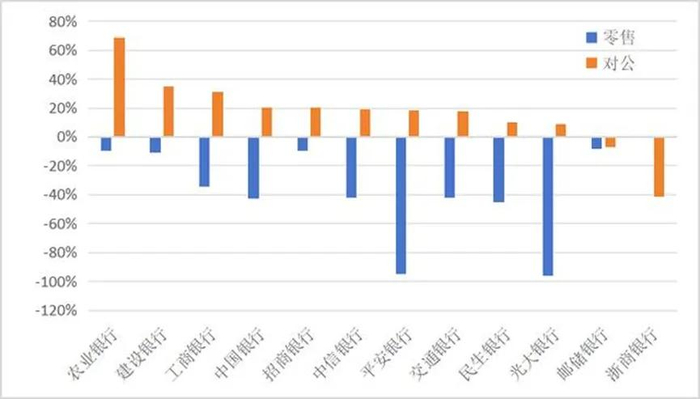 仅农行、民生两家的零售业务保持增量,且明显领先于对公业务增量。