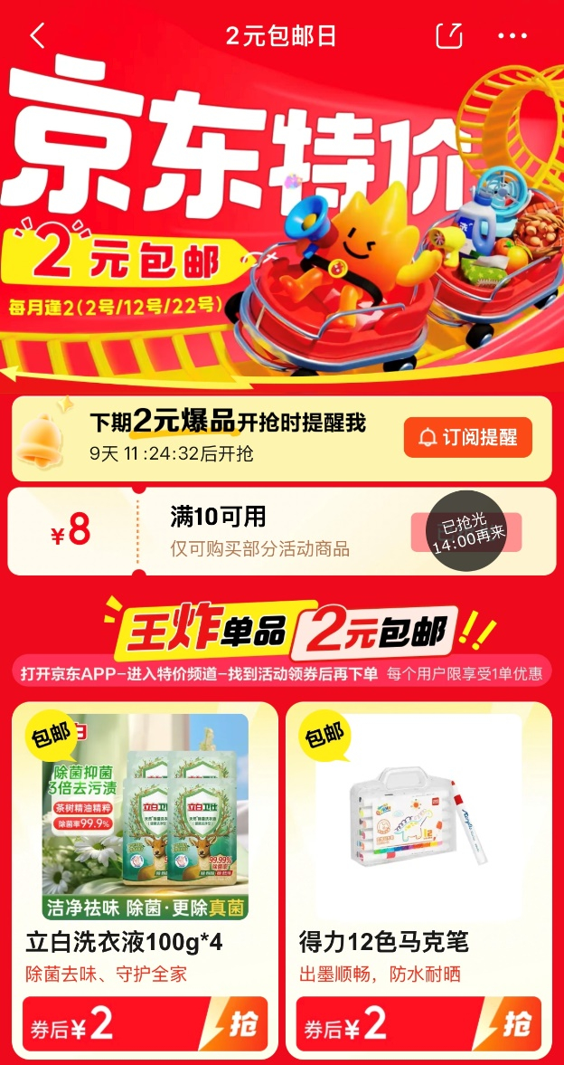 京东特价频道上线“2元包邮”活动,全天不定时抢购低价好物