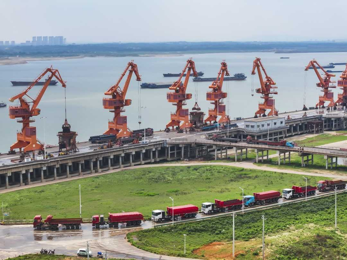 4月21日,江西省南昌县赣江河畔,姚湾综合码头船来车往,一派繁忙。