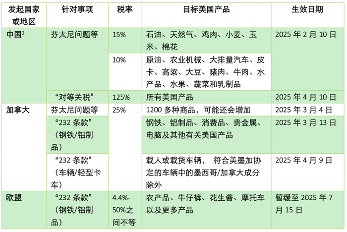 截至目前,其他国家或地区实施的主要反制关税情况汇总如下表。