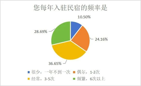 受访者每年入驻城市民宿的频率调查结果显示,每年入住3次以上的受访者占65.33%(其中每年入住6次以上受访者占28.69%)。