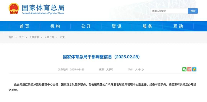 据北京日报此前报道,3月26日,国家体育总局发布消息,免去周继红的游泳运动管理中心主任、国家跳水队领队职务,按国家有关规定办理退休手续。