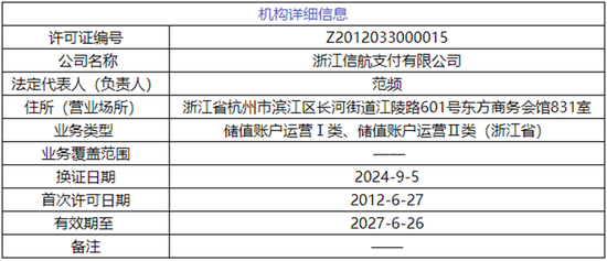 据移动支付网了解,信航支付原名“浙江航天电子信息产业有限公司”,因为监管最新规定,2024年进行了更名。信航支付成立于2002年,并于2012年获得人民银行《支付业务许可证》,获准开展预付卡发行与受理(范围仅限浙江省)以及互联网支付业务。信航支付牌照分别在2017年、2022年完成两次续展,有效期延至2027年6月26日。在支付业务类型重新划分后,信航支付业务类型也相应调整为“储值账户运营Ⅰ类、储值账户运营Ⅱ类(浙江省)”。