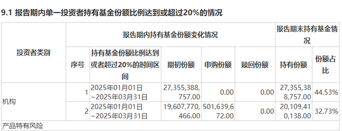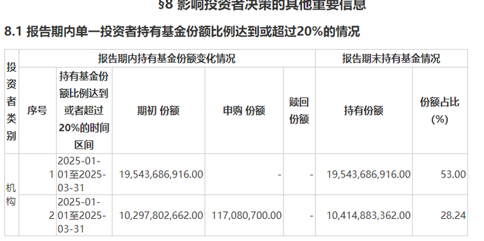 华泰柏瑞沪深300ETF最新披露的2025年一季报显示,从持仓数据来看,今年年初,名为“机构2”的投资者持有该ETF份额达 266.21亿份。回溯该ETF去年年报可知,截至去年年末,中央汇金资产管理有限责任公司持有份额同样为266.21亿份。值得关注的是,在今年一季度,“机构 2”(即中央汇金资产管理有限责任公司)进一步出手,对该ETF实施增持操作,增持份额达3.63亿份,持有份额增加至269.84亿份。