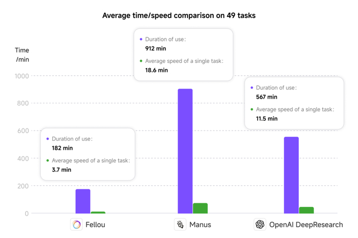 “从执行速度层面来看,Fellou 也优于其他相似产品。”据介绍,在 49 个任务中,Fellou 的平均耗时仅为 3.7 分钟,相比较 Manus 的 18.6 分钟和 Deep Research 的 11.5 分钟皆有显著的速度优势。