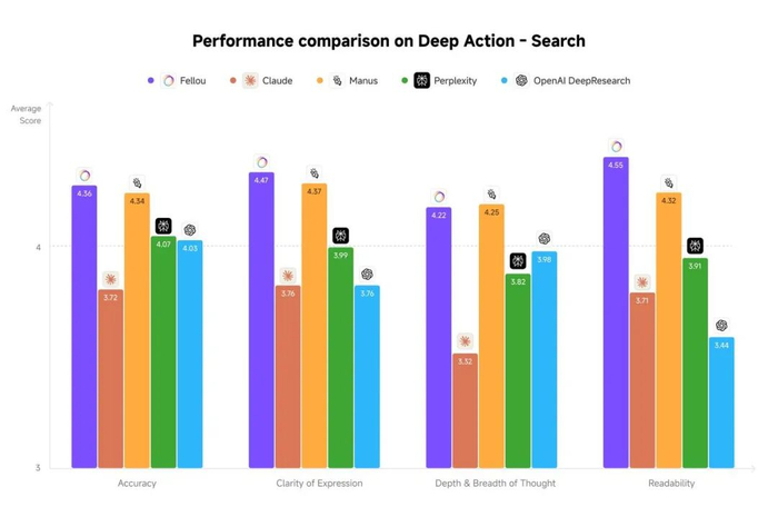此外,Fellou 团队称,为验证浏览器生成的报告效果,他们找了 60 个用户测评,分准确性、描述清晰性、思考深度和广度、可读性五大维度,和 OpenAI 的 Deep Research、Manus、Perplexity 做了打分比较,结果是 Fellou 的综合评分为最高,其中可读性 > 表述清晰性 > 准确性 > 思考深度和广度。