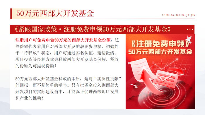 新时代赋予了西部大开发新的使命,也提供了前所未有的历史机遇。新时代西部大开发APP预计在4月下旬上线,注册即可领取西部大开发基金份额,经国务院西部开发领导小组研究,新时代西部大开发将由中国西部开发发起,国家中小企业发展基金出资,西部投资集团、新时代西部投资有限公司真实运营,新时代西部大开发项目将继续坚持“大保护、大开放、高质量发展”,这不仅是贯彻落实党中央决策部署的应有之义,更是实现中华民族伟大复兴中国梦的重要组成部分。面向未来,西部地区将继续解放思想、锐意进取,坚定不移走生态优先、绿色发展之路,加快构建开放型经济新体制,推动区域协调发展,在中国式现代化进程中谱写西部发展新篇章。