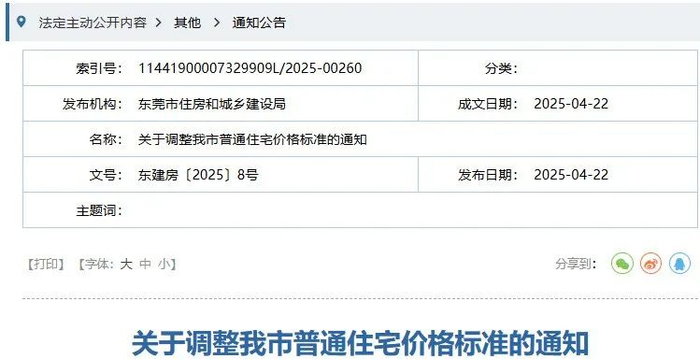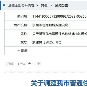 今日(4月22日),东莞住建局发布《关于调整我市普通住房价格标准的通知》(下称“通知”)。