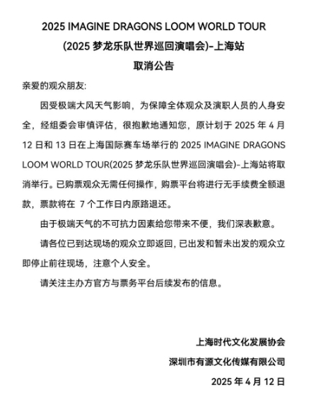 4月11日深夜,嘉定气象局发布大风蓝色预警,并提示12日上午将出现7-9级雷雨大风,12日至13日陆地阵风7-8级。12日下午13时40分更新大风蓝色预警为大风黄色预警信号,12日下午四点左右,主办方发布梦龙乐队上海站演出取消公告,并写到“由于极端天气的不可抗力因素给您带来不便,我们深表歉意。”