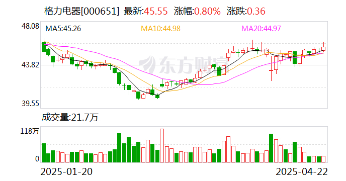 4月22日,格力电器小幅上涨0.80%,股价报45.55元/股,总市值达2551亿元。