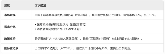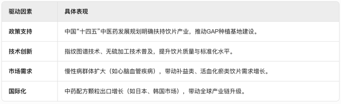 欧盟等市场对中药饮片注册门槛逐步放宽,具备国际认证(如EU-GMP)的企业将加速出海,东南亚传统医药市场成新增长极。此外,老龄化催生慢性病调理需求,补益类饮片(黄芪、当归)及即食化产品(养生茶包、药膳包)将渗透日常消费场景,推动行业向“医疗+大健康”双轮驱动转型。