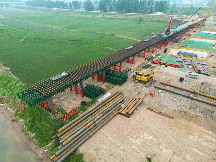 “应河道主管部门安全度汛要求,汛期前需施工完成桩基及下部结构施工,项目部精细策划,合理安排工期计划,组织人员设备24小时不间断施工。”建工水利司马庄路大桥及接线工程项目执行经理于洋表示,目前北岸滩地内10#-14#墩桩基已施工完成,已进行工序转换下部结构施工。在汛期来临前完成滩地内下部结构施工。按照总施工计划本年完成下部结构施工,引桥上部结构及桥面系完成50%。