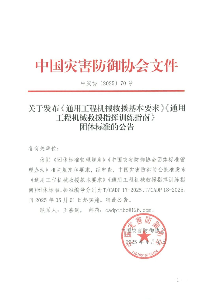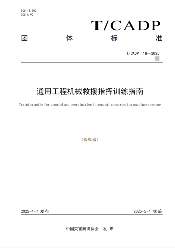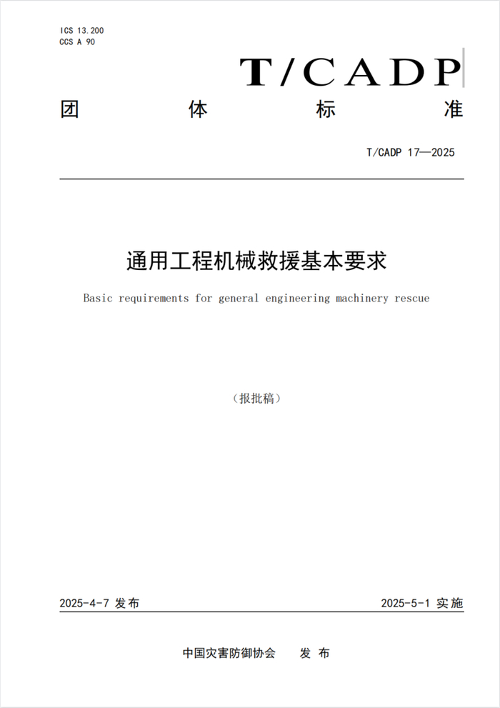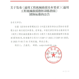 近日,中国灾害防御协会批准发布《通用工程机械救援基本要求》(以下简称《要求》)《通用工程机械救援指挥训练指南》(以下简称《指南》)两项团体标准,标准编号分别为 T/CADP 17-2025、T/CADP 18-2025,将于2025年5月1日起实施。