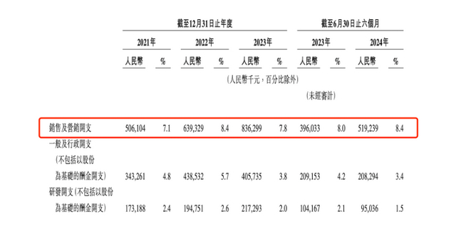 另一方面,销售及营销开支也逐年走高。2021年至2023年,该公司销售及营销开支分别为5.06亿元、6.39亿元、8.36亿元,占同期收入的比例分别为7.1%、8.4%、7.8%。2024年上半年,销售及营销开支为5.19亿元,占同期收入的比例为8.4%。