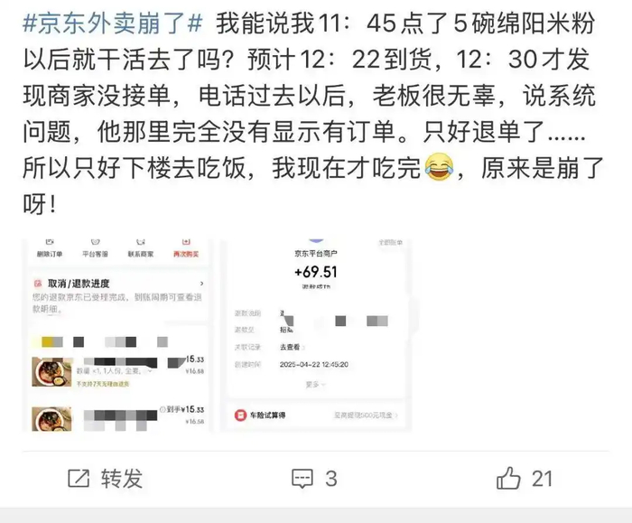 但理性来看,这轮补贴对消费者的“真实价值”依然是阶段性的:价格可以引流,服务才是留存。京东外卖系统多次崩溃、履约体验不稳的情况,也引发不少用户“薅一单就走”的心态;而美团即便价格略高,却仍有稳定履约与品类丰富的支撑。
