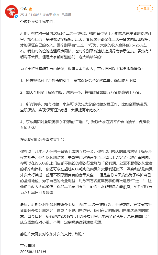 4月21日,京东集团罕见以一封致外卖骑手的公开信拉开战幕,直指“竞对平台”逼迫骑手“二选一”,并声称因对方干预骑手接单,导致订单延迟,为此京东将对所有超时20分钟以上订单实行全额免单。话音未落,刘强东亲自下场送外卖、请骑手吃火锅、现场宣讲五险一金和退休金制度,一整套温情操作打出一套“情绪组合拳”,在网上迅速激发起大众情绪共鸣。
