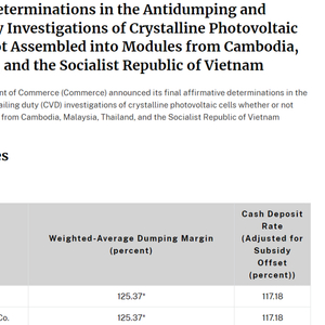 当地时间4月21日,美国商务部宣布对来自柬埔寨、马来西亚、泰国和越南的晶体光伏电池(无论是否组装成组件)的反倾销税和反补贴税(“双反”)调查做出最终裁定。根据这项裁定,该部门计算的有关东南亚四国太阳能产品的反倾销税税率为6.1%至271.28%,具体取决于企业和国家。反补贴税税率在14.64%至3403.96%之间。这四个国家目前供应美国约77%的光伏组件,去年对美出口太阳能设备总值达129亿美元。