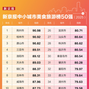 据悉,《新京 报中小城市美食旅游榜(2025)》以2024年4月-2025年3月在抖音平台话题榜为分析对象,聚焦三线及以下非省会城市,并通过上榜话题数量、曝光增量和参与人数增量等相关指标的计算,呈现了一批以美食、旅游为核心吸引力的中小城市在短视频平台上的传播表现。