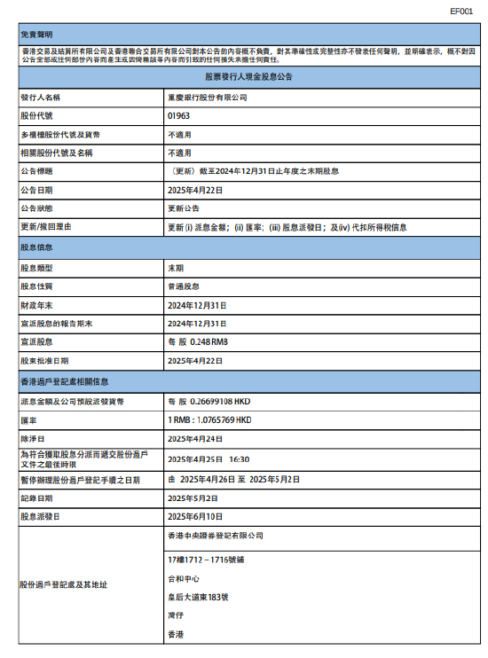 重庆银行:将于6月10日派发末期股息每股0.26699108港元 金融一线 2025.04.2221:43 关注 4月22日金融一线消息,重庆银行发布公告称,将于2025年6月10日派发截至2024年12月31日止年度的末期股息每股0.26699108港元。