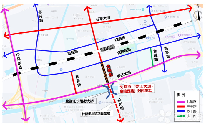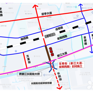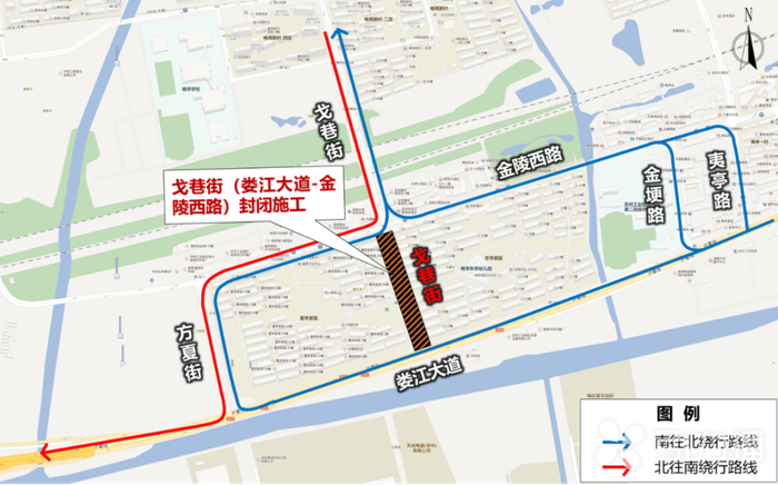 施工期间,过境戈巷街(金陵西路-娄江大道)的车辆行人,可通过方夏街、金埂路、夷亭路等道路通行。