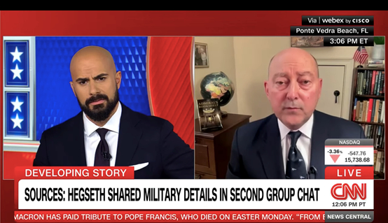 斯塔夫里迪斯周一接受美国有线电视新闻网(CNN)采访时称,赫格塞思曾接受过如何保守国家秘密的训练,“他必须明白自己没有做好这一点”。据多家美国媒体4月20日披露,美国国防部长赫格塞思今年3月15日在一个包括其妻子、弟弟在内的私人Signal(信号)聊天群中提前泄露了美军即将对也门发动空袭的相关作战信息。这已是赫格塞思近来第二次陷入“群聊泄密”事件,此前他在一名记者“误入”的美国国家安全高官群聊中分享打击也门胡塞武装方案。