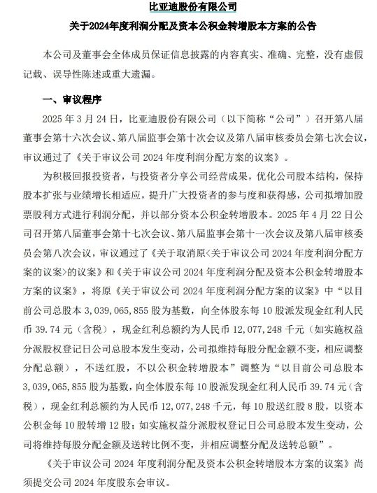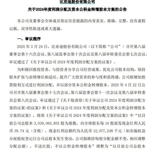 4月22日晚,比亚迪公告,为积极回报投资者,与投资者分享公司经营成果,优化公司股本结构,保持股本扩张与业绩增长相适应,提升广大投资者的参与度和获得感,公司拟增加股票股利方式进行利润分配,并以部分资本公积金转增股本。